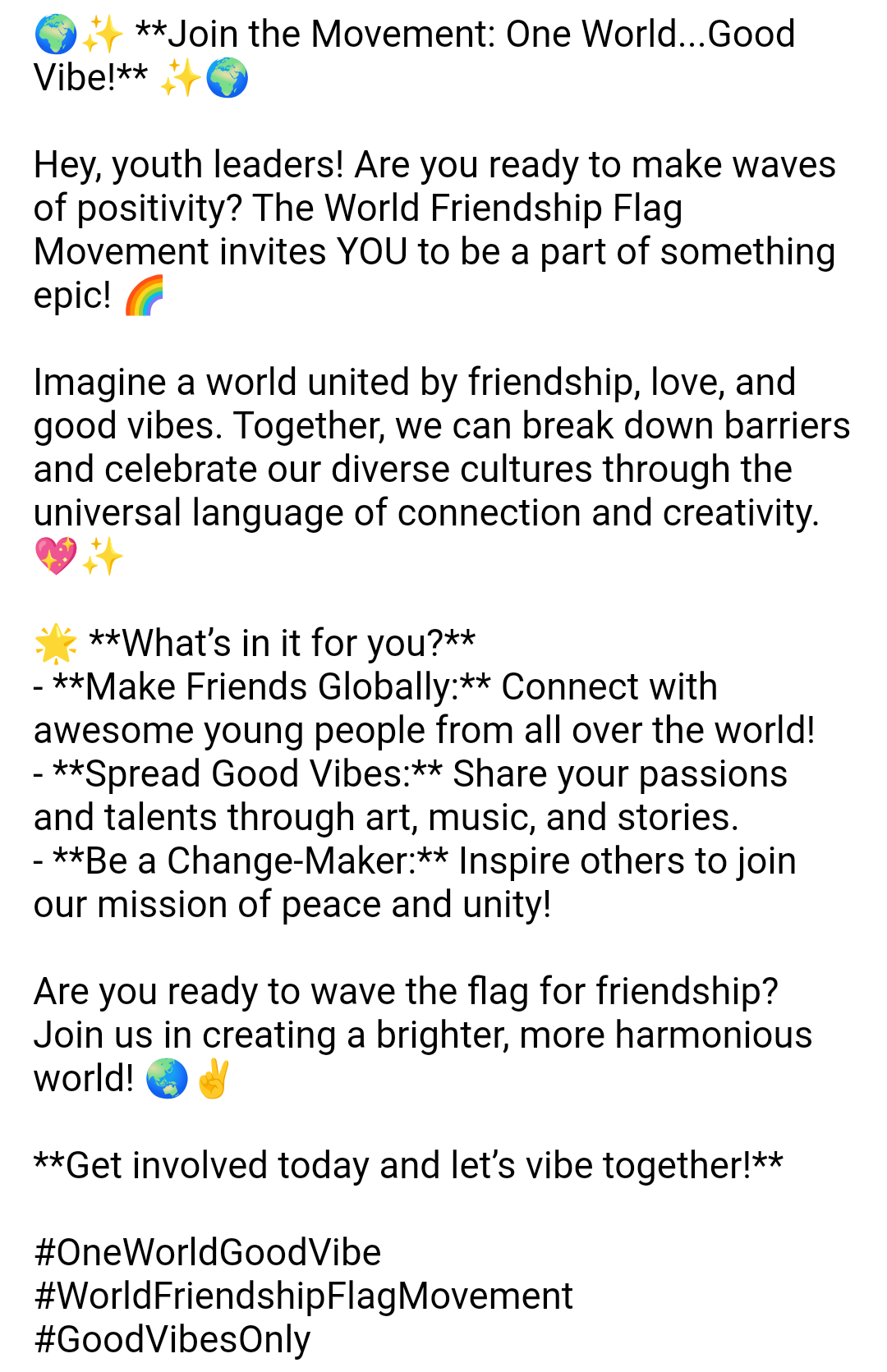 Together, we can create a world where friendship knows no boundaries, and the spirit of cooperation thrives in every interaction. Let the "World Friendship Flag" fly high as a testament to our shared humanity and our unwavering dedication to a peaceful and connected world.
