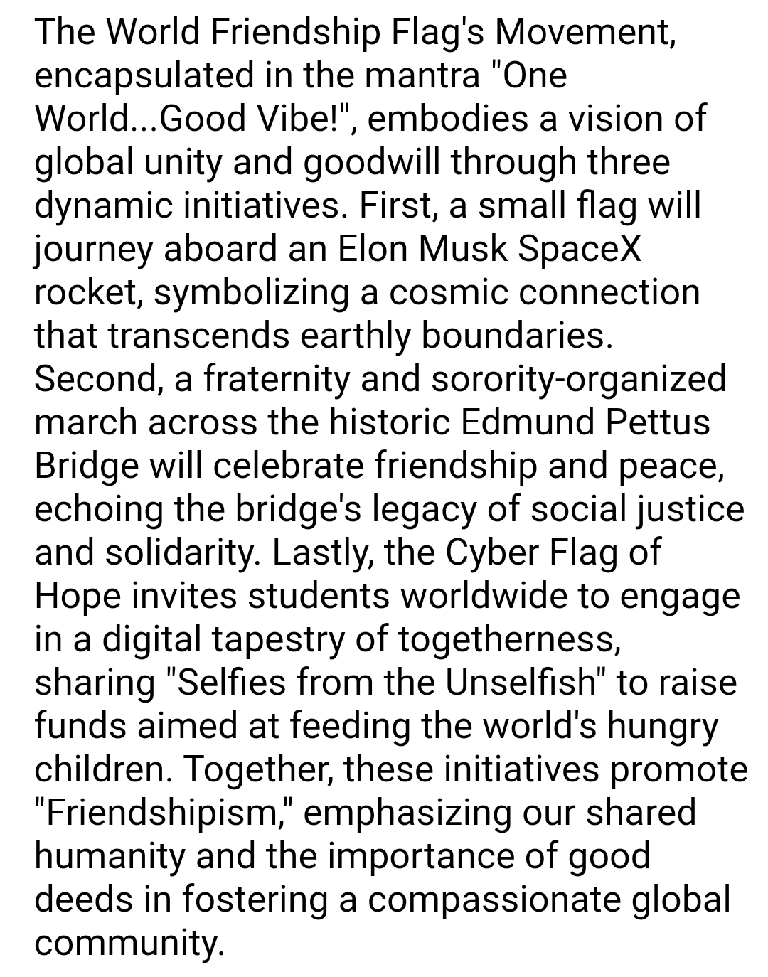 "The World Friendship Flag stands as a beacon of hope and connection", first and foremost, to claim the worldwide spirit of friendship. It represents our collective commitment to fostering relationships built on respect, empathy, and shared values.